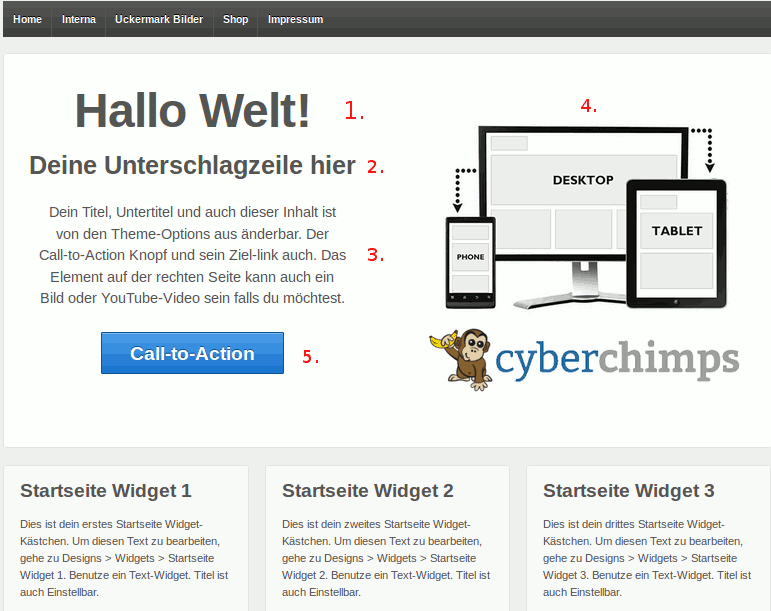 Pro forma sind auch 3 Standard-Widget-Bereiche aktiv, die z.B. für eine Portfolio-Übersicht oder Zusatzinfos genutzt werden können. Optional können aber auch noch Kolophon-Widgets und sogar Footer-Widgets angezeigt werden. Man sollte es aber bei einer Landingpage nicht übertreiben.
