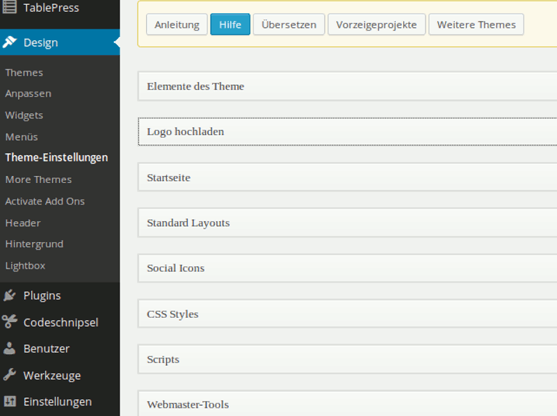 Unter Elemente des Themes verbergen sich Optionen wie das Deaktivieren einer breadcrumb-Navigation, Deaktivieren des CTA-Knopfes (:o)) oder auch die Ausgabe von minified CSS.